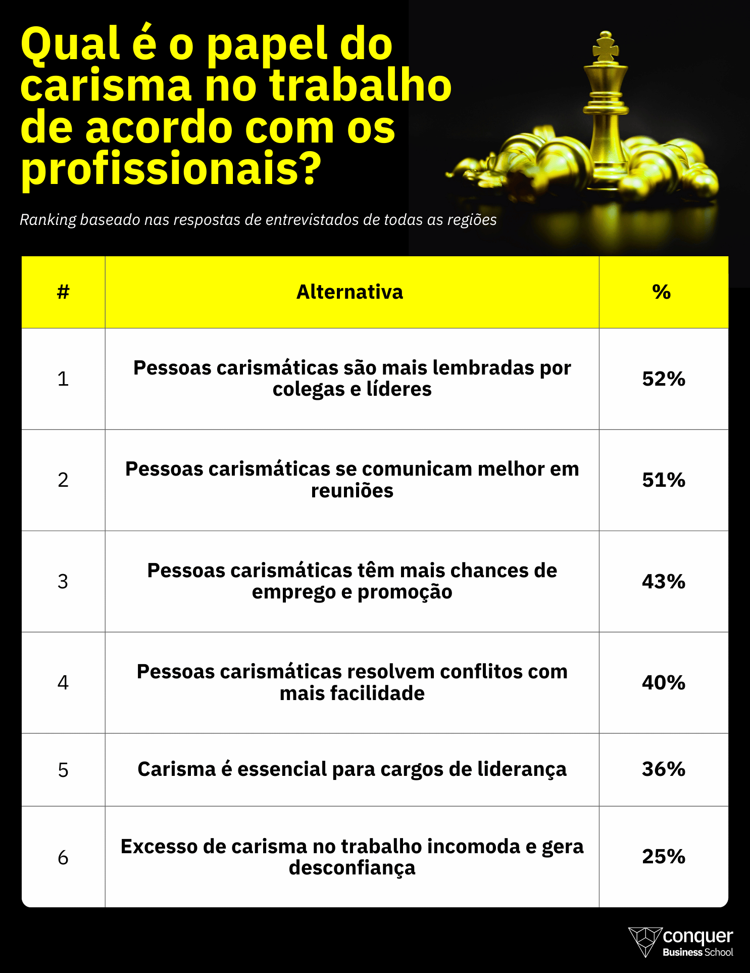 Embora muitos ainda acreditem que o carisma seja algo inato, a pesquisa da Conquer revela não só que alguns profissionais enxergam essa característica como uma habilidade, mas que de fato tentam cultivá-la diariamente no ambiente corporativo.
