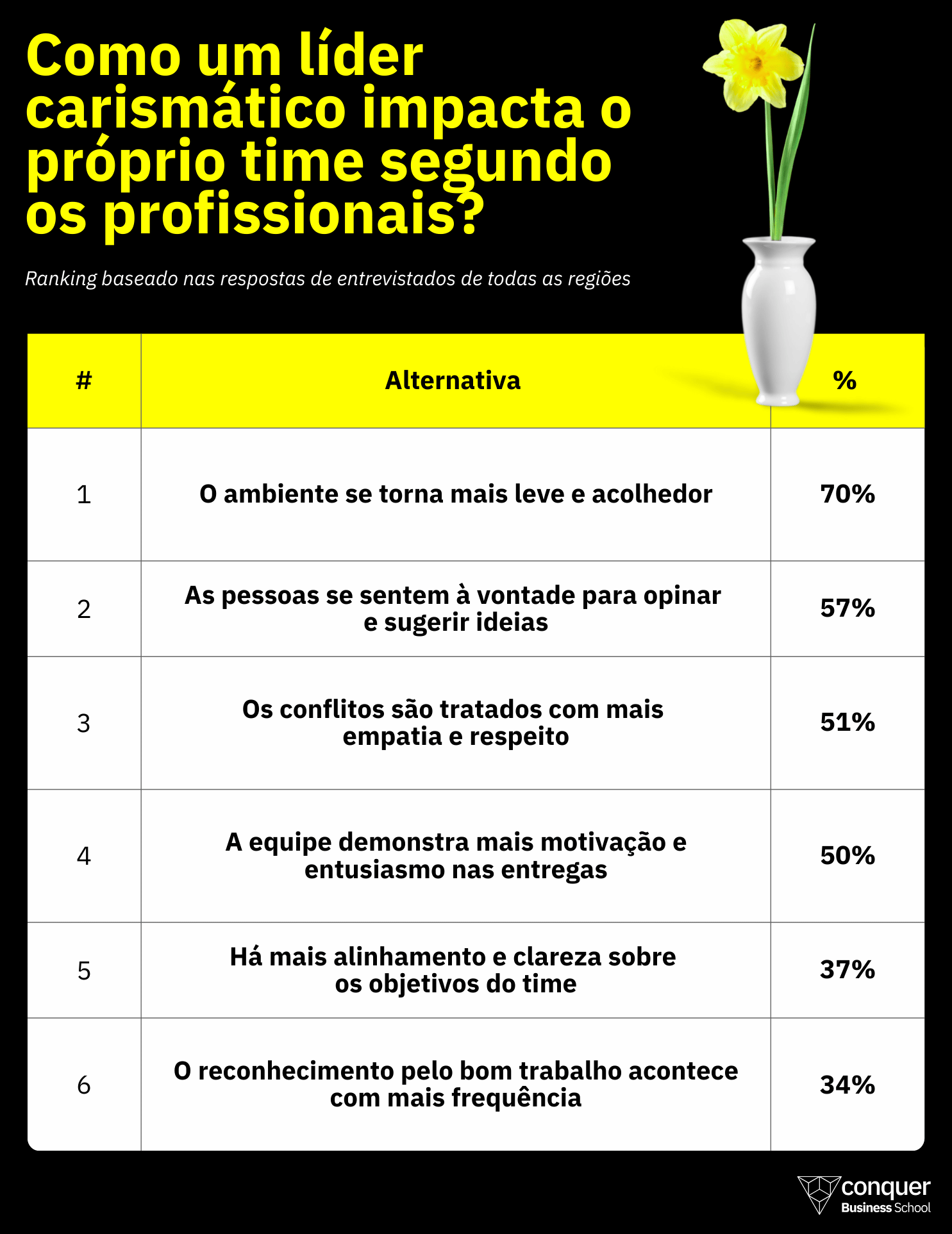 Para 36% dos profissionais ouvidos pela Conquer, o carisma é uma competência essencial para quem ocupa cargos de liderança. No entanto, a avaliação sobre seus líderes atuais é menos animadora: somando os que consideram seus gestores pouco carismáticos (11%), nada carismáticos (8%) e até mesmo neutros (29%), a maioria dos entrevistados apontam que seus superiores falham quando o assunto é engajar e motivar equipes.